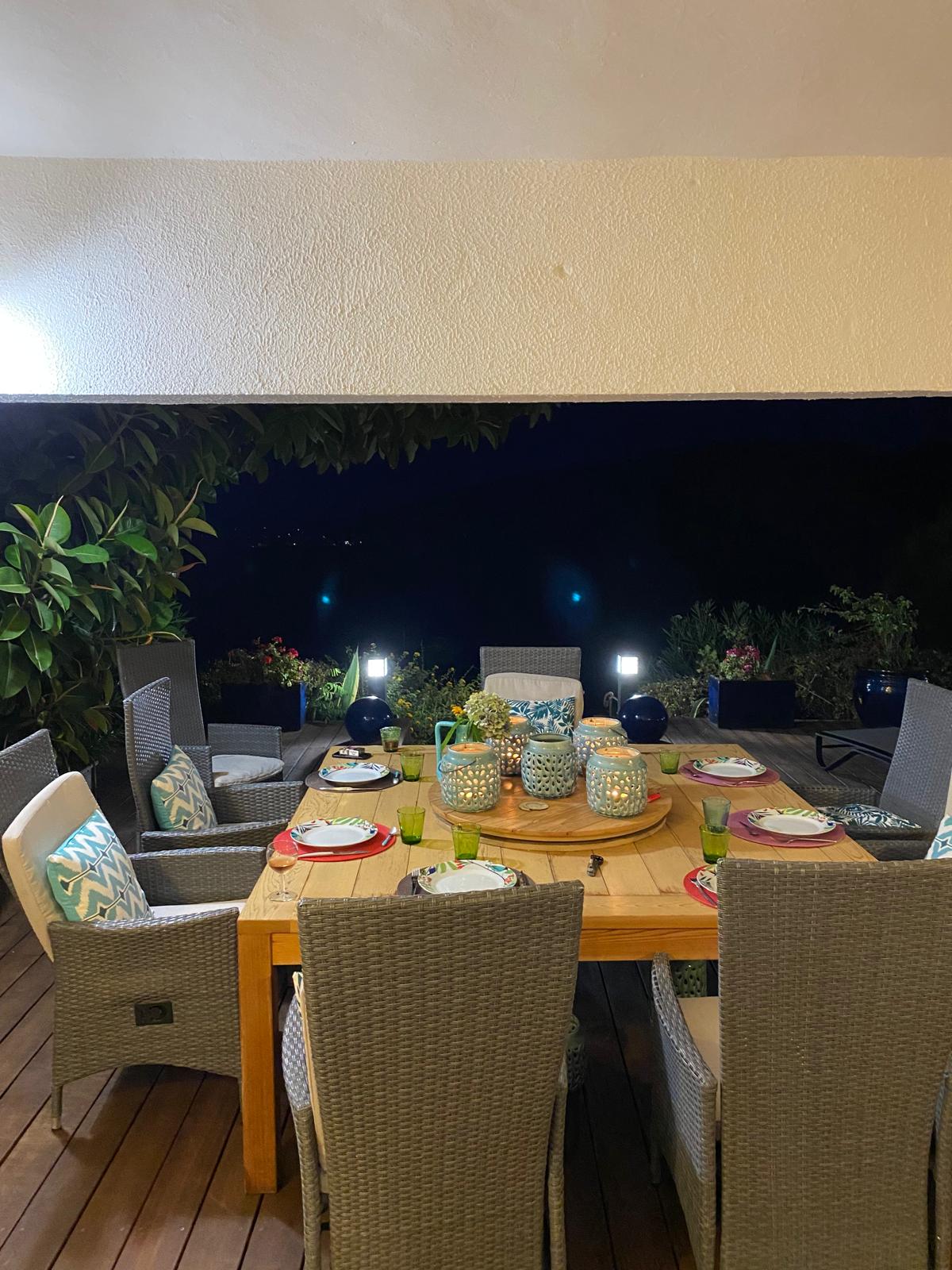 - salle à manger extérieure de plain-pied sur terrasse couverte, vue mer ;