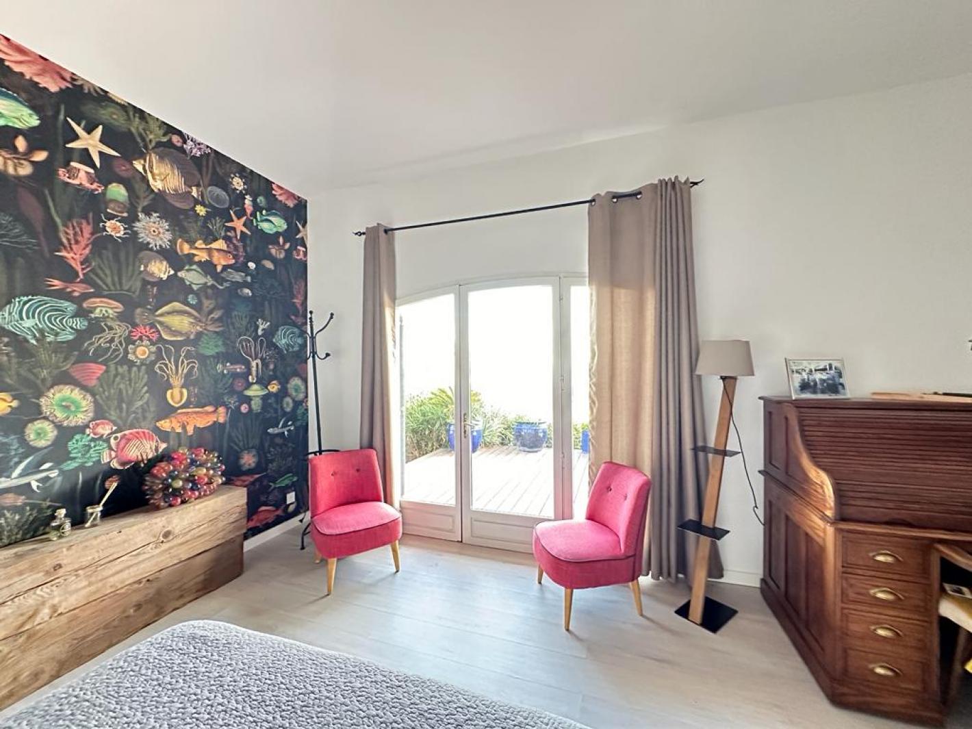 - 1 master bedroom de 22 m² climatisée avec un lit de 160, salle de bain et dressing attenants, vue mer ;